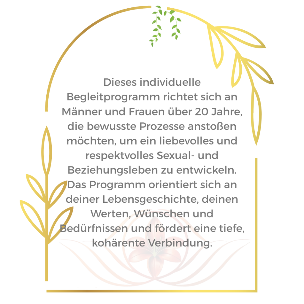 Dieses individuelle Begleitprogramm richtet sich an Männer und Frauen über 20 Jahre, die bewusste Prozesse anstoßen möchten, um ein liebevolles und respektvolles Sexual- und Beziehungsleben zu entwickeln. Das Programm orientiert sich an deiner Lebensgeschichte, deinen Werten, Wünschen und Bedürfnissen und fördert eine tiefe, kohärente Verbindung.